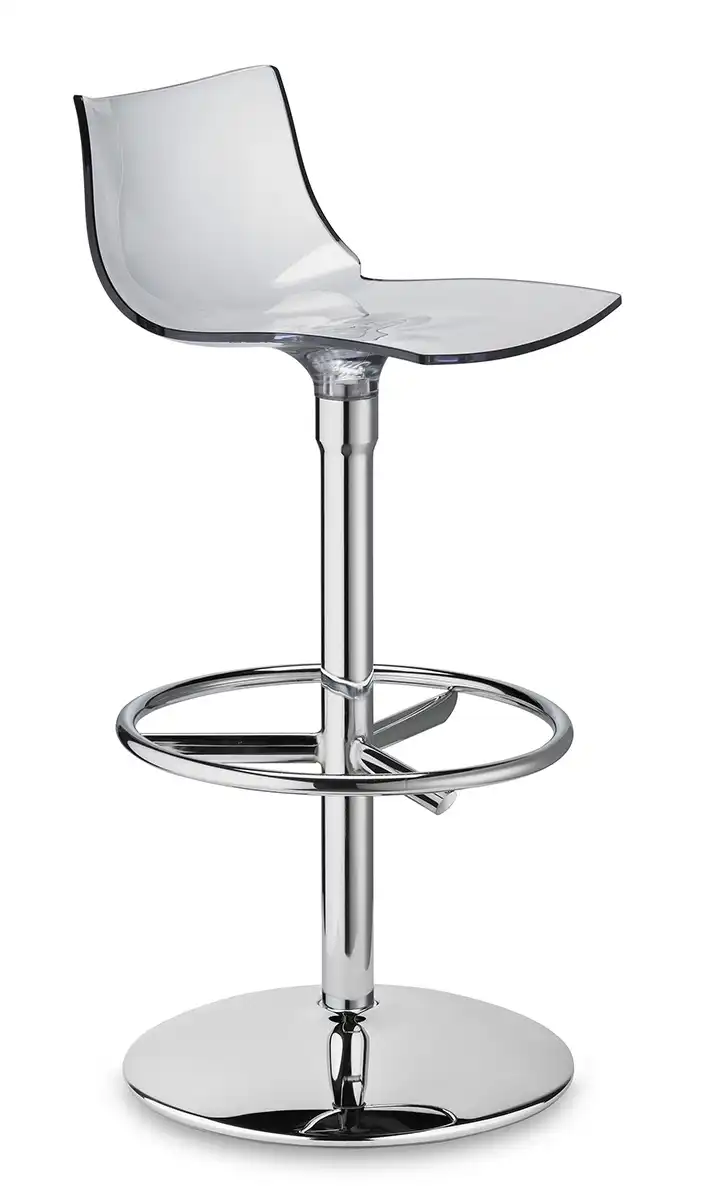 Výškově nastavitelná, chromovaná otočná barová židle, plastový sedák. Vhodná do interiéru. Výška 75 cm.