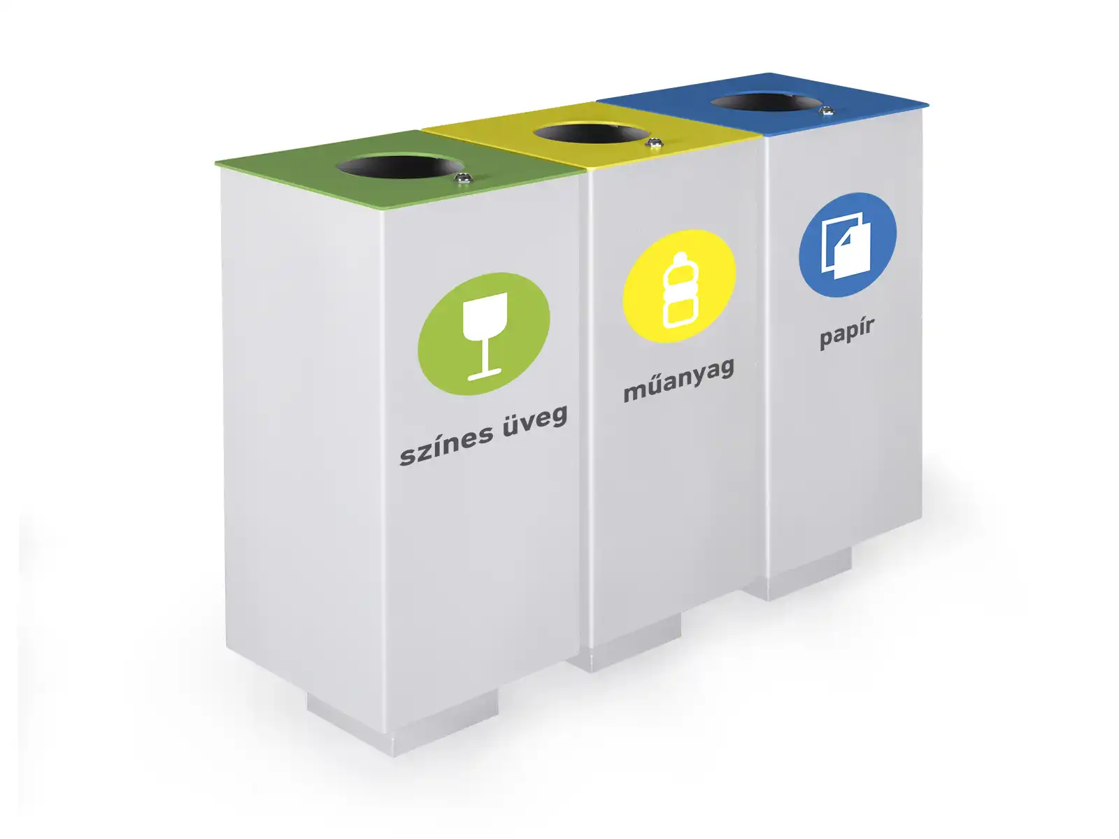 Cube venkovní odpadkové koše pro tříděný odpad. Odnímatelné barevné uzamykatelné víko. K dispozici také s piktogramy. Pozinkovaná ocel, prášková barva pro venkovní použití.